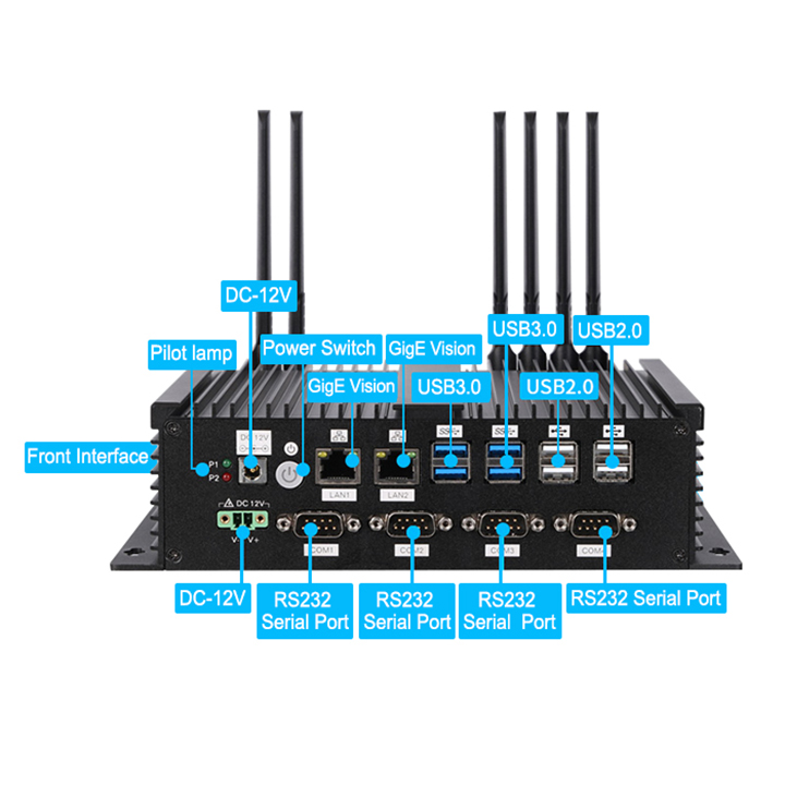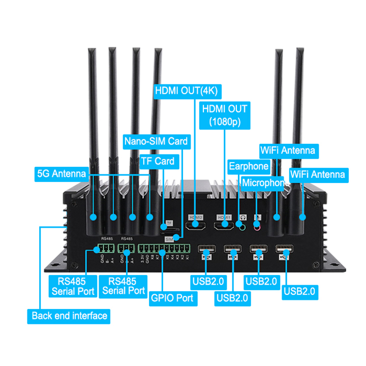 | Other ports: | 6*USB2.0/2*RS232/TF card reader/SIM card slot/RJ45/Type-C/GPIO/serials ports/Mic/earphone/DC input |