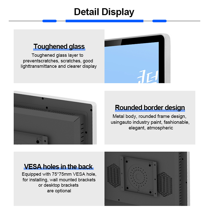 3. I/O interface: VGA *1, HDMI *2, Audio in/out inputs, USB port(touch screen)