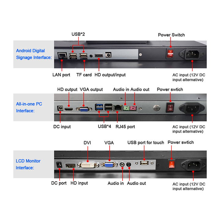 1.Standard HDMI/DVI/VGA inputs, DP optional